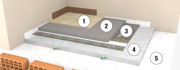 Die Trittschalldämmung der Fußböden wird durch die Verlegung des Schalldämmbelags MICROBIT 4+2 mit einer Stärke von 6 mm erreicht, der aus einem chemisch vernetzten Polyethylen mit einer Dichte von 30 kg/m³, E.V.A.-Zusatz und einer Stärke von 4 mm besteht, das mit einer Elastomermembran von 2 kg/m² verbunden ist. Dieses Produkt wird in Rollen von 1,20 x 5 m geliefert und bietet einen Trittschalldämmwert von ΔLnw=35 dB (nach UNI EN ISO 140/7 und UNI EN ISO 717/2), eine dynamische Steifigkeit s’=33 MN/m³ (nach UNI EN 29052-1) und einen Kompressibilitätswert von 0,27 mm (CP 2) (nach UNI EN 12431). Bei der Verlegung dieses Produkts ist darauf zu achten, dass die Kanten zusammengefügt und alle Fugen mit dem Klebestreifen ROTOCELL AD abgedichtet werden. Die Abtrennung von den Wänden erfolgt mittels durchgehender Befestigung im gesamten Raum mit dem speziellen Randdämmstreifen SUPERFASCIA AD, der aus der Höhe des fertigen Bodens herausragen muss.