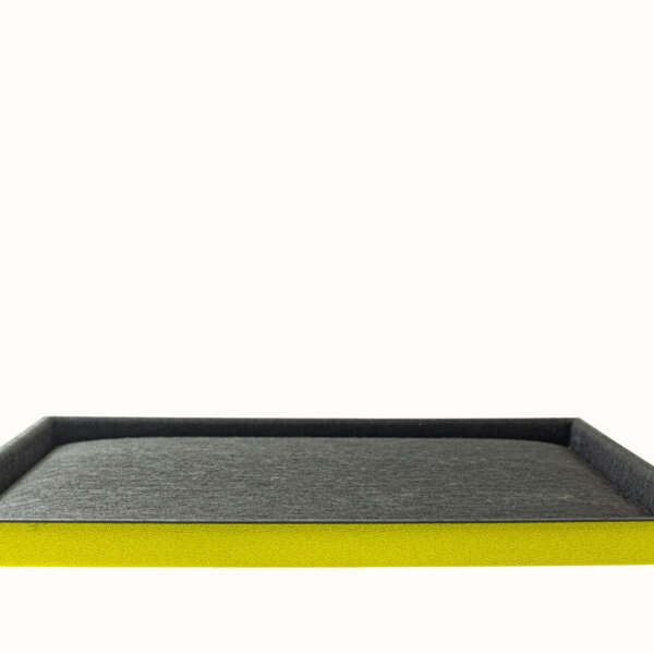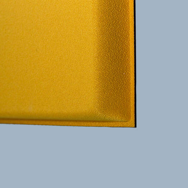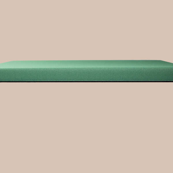 Mono-material sound absorbing panel 40 mm thick with variable density, composed of a recycled polyester fiber core and a coloured fabric covering on the flat side. The rear side of the panel is distinguished by its special shell shape, whose maximum thickness point coincides with the centre of gravity of the panel. The perimeter is fitted with a rigid edge with support function for applications inside metal suspended ceilings.